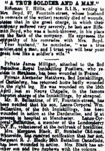 George Boyd or as he was known, trooper Boyd was in the Inniskilling, not sure which. The only thing I know about George was that he was caught in massive shell fire and was buried for three days. According to my aunt Evelyn he was discovered on an island, this could have been Salonica, or part of modern day Greece. The story goes that his parents had to search for their son after the war.