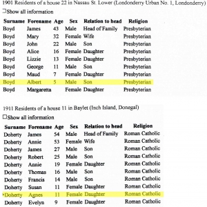 Albert came back from the war but his struggle never stopped, selling his pension in England to Vulgers who prayed on young soldiers coming back from the war. He married Agnes a Catholic girl from Baylet on Inch Island in Co. Donegal and raised a large family. Agnes died in 1956 from asthma, so he was left to bring up a family on his own. They moved to Moss Road in Derry.