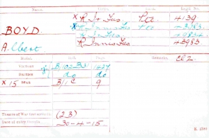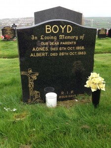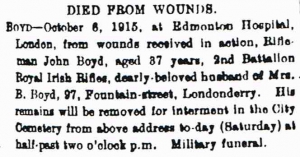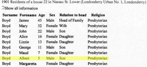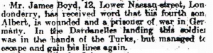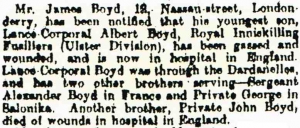 Alex Boyd survived the war, physically anyway. He was in the 10th Inniskillings. John Boyd died of wounds at war and was buried in city cemetery. He was in the Royal Irish Rifles. George (trooper) Boyd was buried for three days by a shell. He was never the same mentally and died in the fifties at the house he was born in located at 12 Lower Nassau Street. He was in the 10th Inniskillings. Albert Boyd, youngest son was captured by Turks, gassed by Germans, wounded and taken prisoner. He was in the 1st Inniskillings.