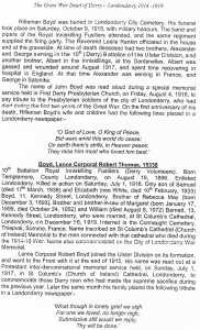 Alex Boyd survived the war, all I know is that he worked at Austins in Derry as a tailor, in his picture you will see him as a Sargent, but I met Alex ‘s son and wife who gave me some of the photos from the first world war.